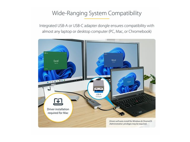 Denna USB-adapter till dubbla HDMI-skärmar gör det möjligt att ansluta två oberoende HDMI-skärmar (1x 4K & 1x 1080p) till din dator med en enda USB Typ-A 3.2 Gen 1 (5 Gbps)-anslutning.