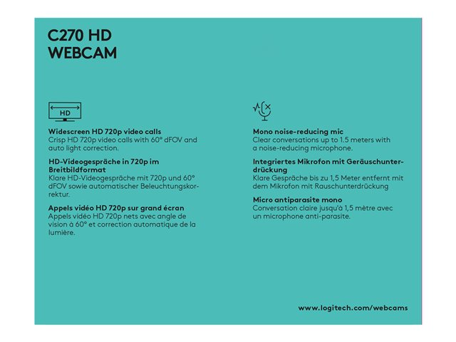The C270 HD Webcam gives you sharp, smooth conference calls (720p/30fps) in a widescreen format. Automatic light correction shows you in lifelike, natural colors.