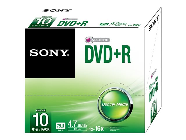 Pack of 10 slim case DVD+R in 16x-speed. The Sony 10DPR47SS is ideal for fast data recording and space saving at home or at the office.