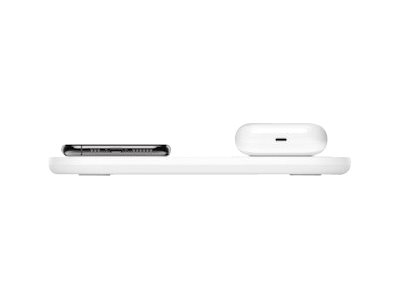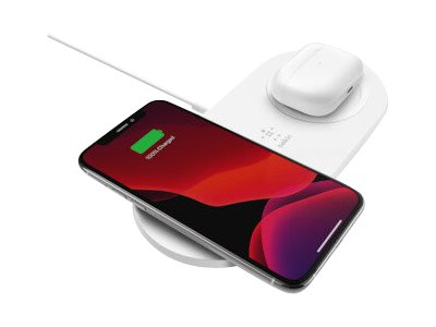 Belkin BoostCharge Dual - Trådlös laddningsplatta + växelströmsadapter - 15 Watt - vit - för Apple iPhone 11, 11 Pro, 11 Pro Max, 8, 8 Plus, X, XR, XS, XS Max; Samsung Galaxy Note10, Note10+, S10, S10+, S10e