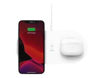 Belkin BoostCharge Dual - Trådlös laddningsplatta + växelströmsadapter - 15 Watt - vit - för Apple iPhone 11, 11 Pro, 11 Pro Max, 8, 8 Plus, X, XR, XS, XS Max; Samsung Galaxy Note10, Note10+, S10, S10+, S10e WIZ008VFWH