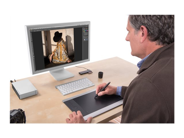 EgenskaperProgrammerbara knappar, fingerkänslig pekring, mjukt gummihandtag, multi-touch-digitaliserare, ExpressKeys, -/+ 60 nivåers lutningsigenkänning