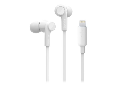 Belkin ROCKSTAR - Hörlurar med mikrofon - inuti örat - kabelansluten - Lightning - ljudisolerande - vit - för Apple 10.5-inch iPad Pro; iPad mini 4; iPhone 7, 7 Plus, 8, 8 Plus, X, XR, XS, XS Max