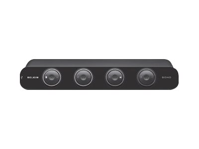 The Belkin SOHO Dual VGA Monitor Desktop KVM Switch lets you share up to two monitors, keyboard, and mouse with up to four computers, saving space on your desk and reducing equipment clutter. The sleek, new design incorporates a built-in USB 2.0 2-port hub with one of the ports conveniently located on the front. This is perfect for connecting an MP3 player, printer, scanner, or any of your USB devices to the KVM Switch while allowing your connected computers to access them. Sensitive push buttons on the front allow for easy switching, and independent audio-switching means you can play music from one computer while accessing files from another.