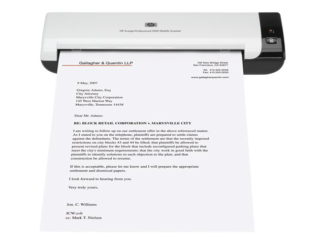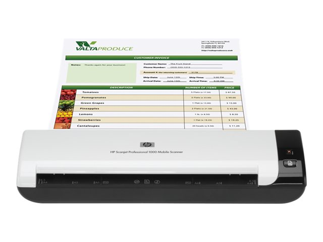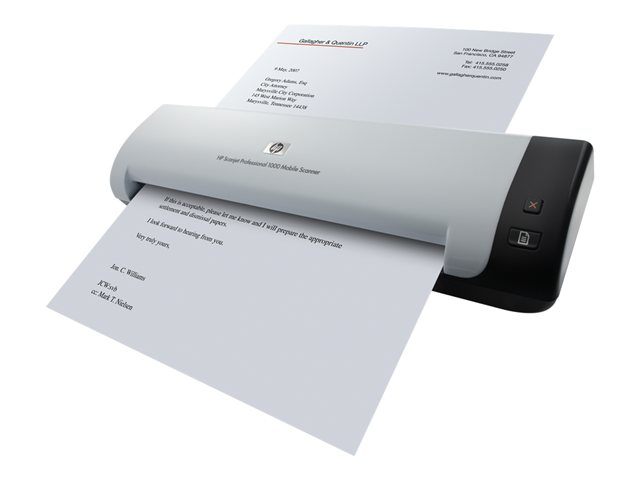 Med HPs robusta, kompakta, bärbara skanner kan du digitalisera dokument på kontoret, på fältet eller när du reser. Den gör det enkelt att skanna visitkort, präglade kort, A4-size-dokument och blanketter med en längd på upp till 34 tum/86 cm, när du vill och var du vill. Skanna enkelsidiga dokument med upp till 5 sidor i minuten och dubbelsidiga dokument med upp till 8 bilder per minut. Skydda skannern med den tåliga transportväskan (medföljer) och förvara den på små, kompakta arbetsplatser.