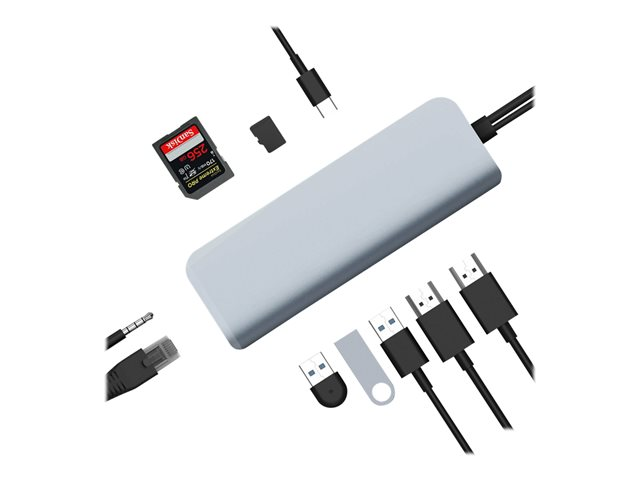 Turns two USB-C ports into 10 ports with 2 x 4K 60Hz HDMI, 3 x USB-A, Gigabit Ethernet, MicroSD/SD, 60W USB-C power delivery, and a 3.5mm audio jack.